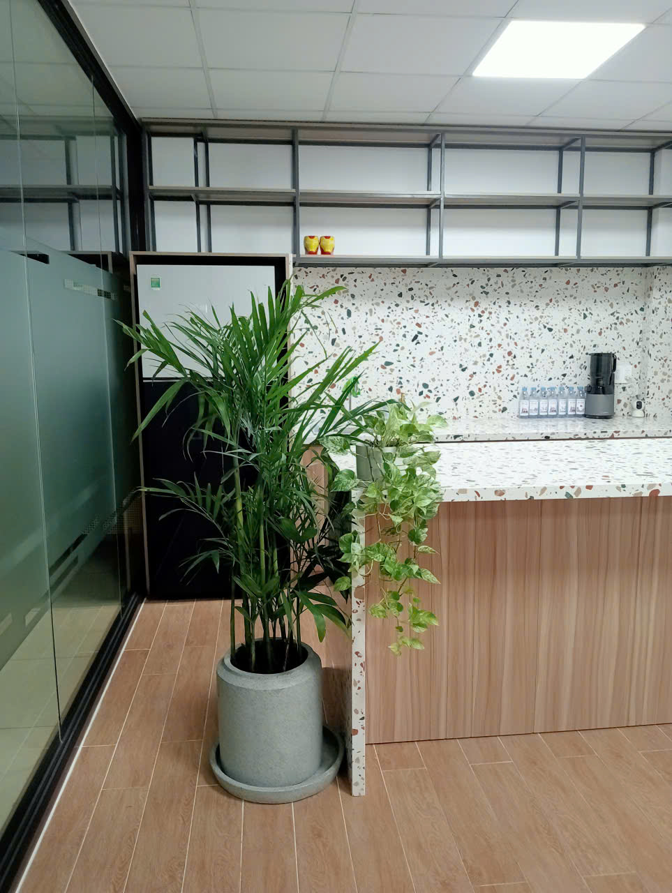 Đối với bàn làm việc, các loại cây kích thước nhỏ như cau tiểu trâm, cây hạnh phúc giúp cải thiện độ ẩm cục bộ và thư giãn thị giác. Cau tiểu trâm được đánh giá cao nhờ khả năng lọc bớt khí độc từ máy tính, máy in.