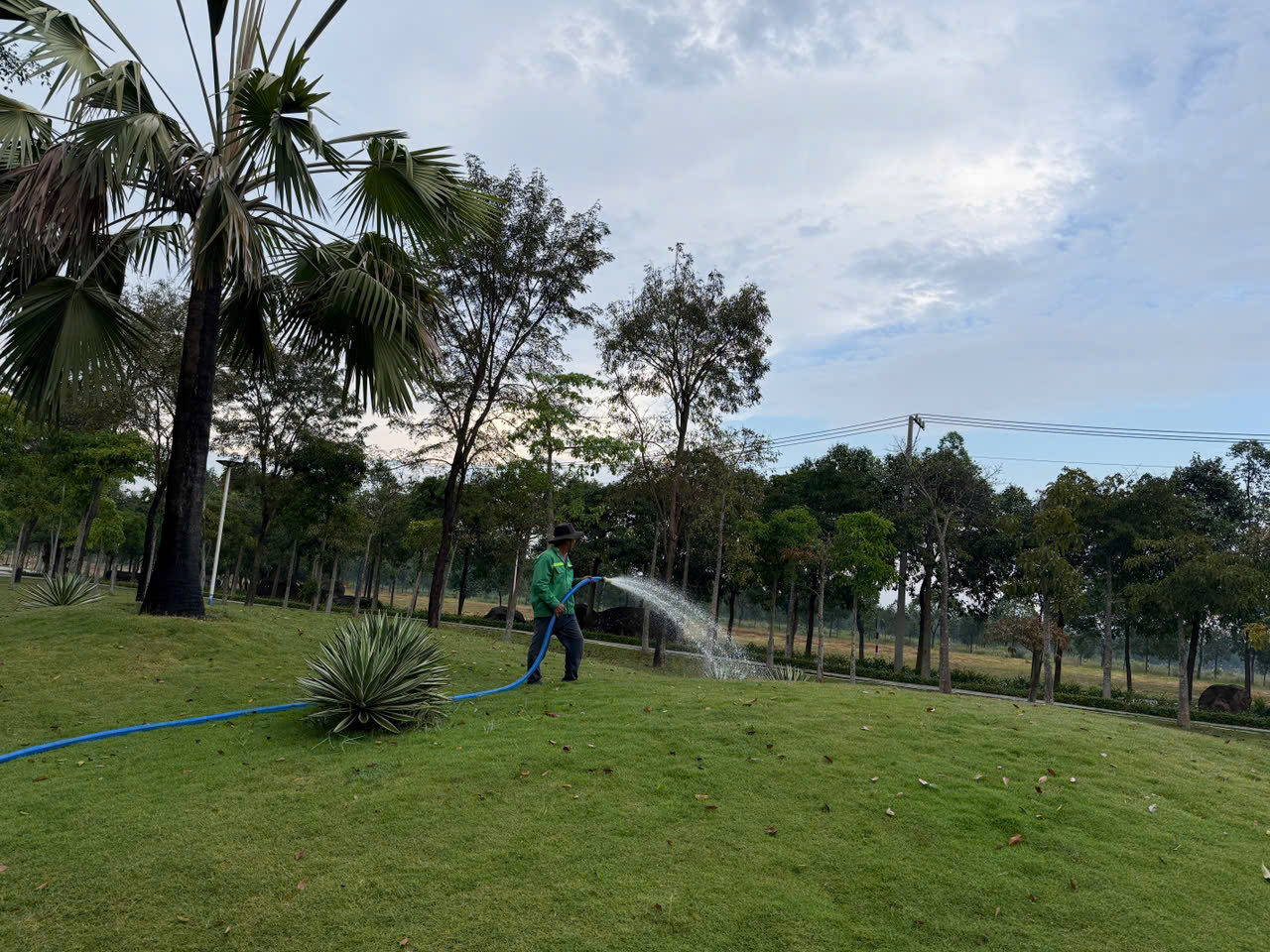 Nhân viên Nguyễn Lê Landscapes sử dụng hệ thống ống dẫn và vòi tưới công suất lớn để tưới đều trên diện tích rộng, giúp tiết kiệm thời gian và bảo đảm hiệu quả.