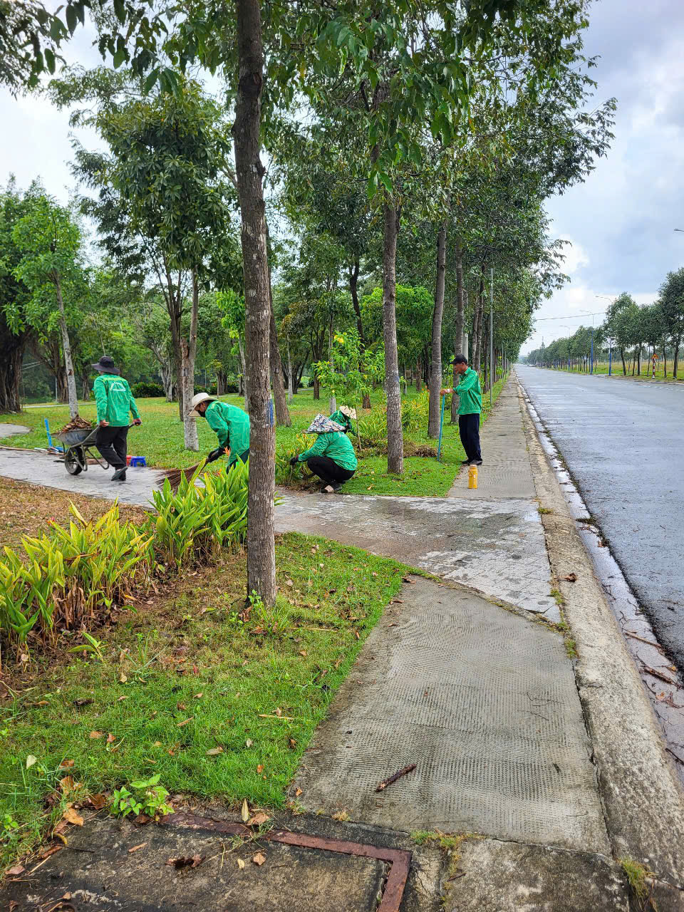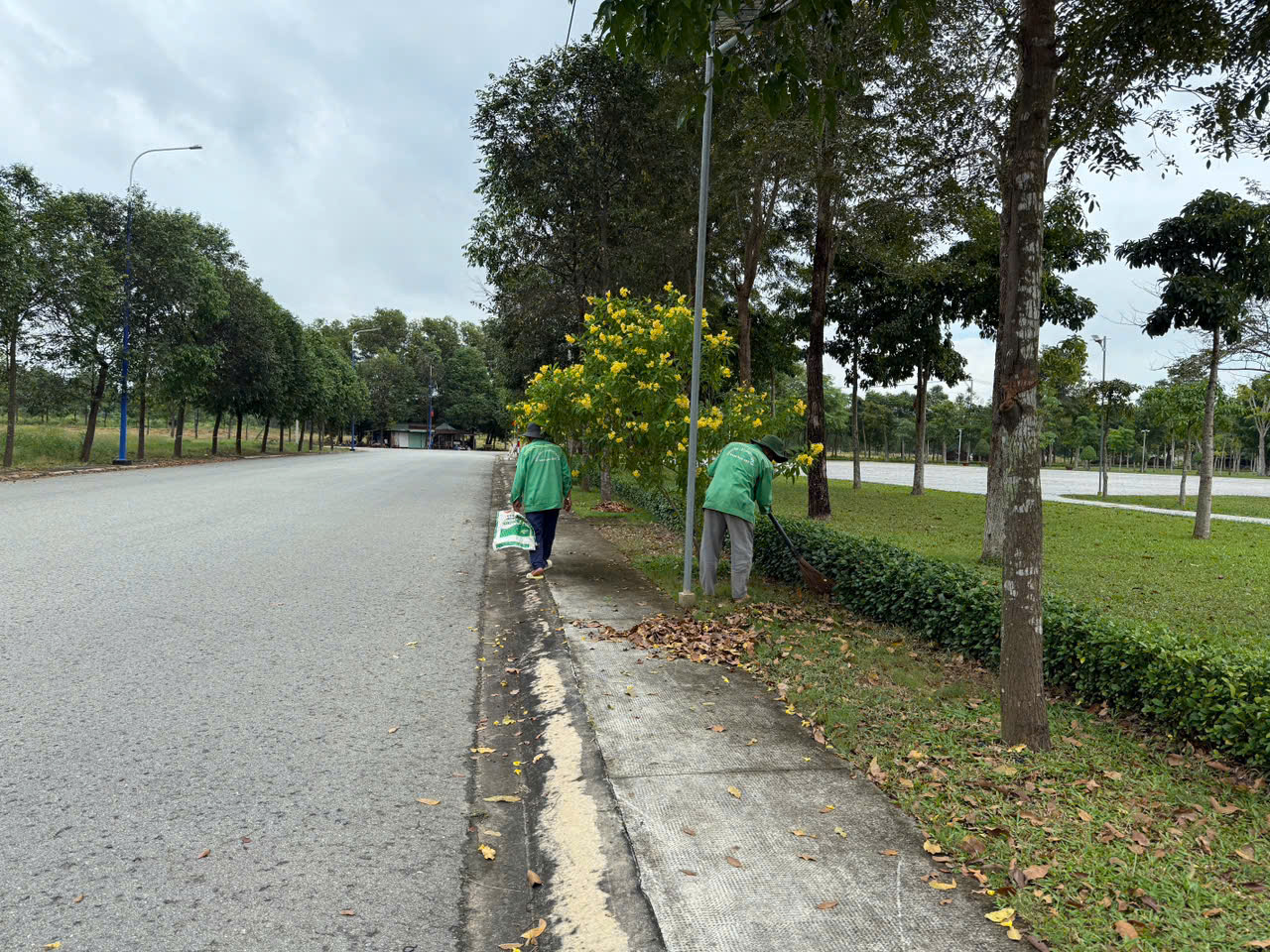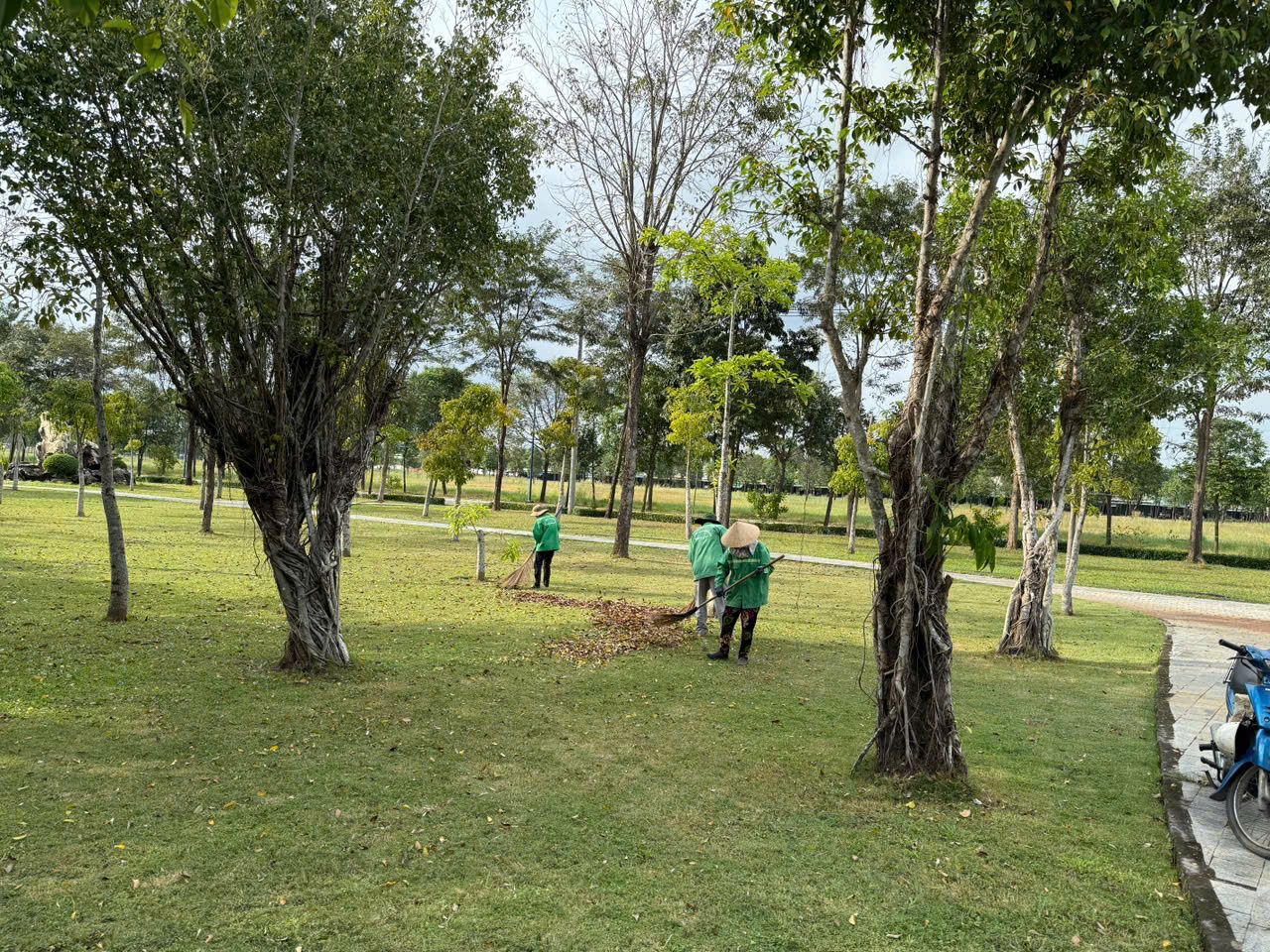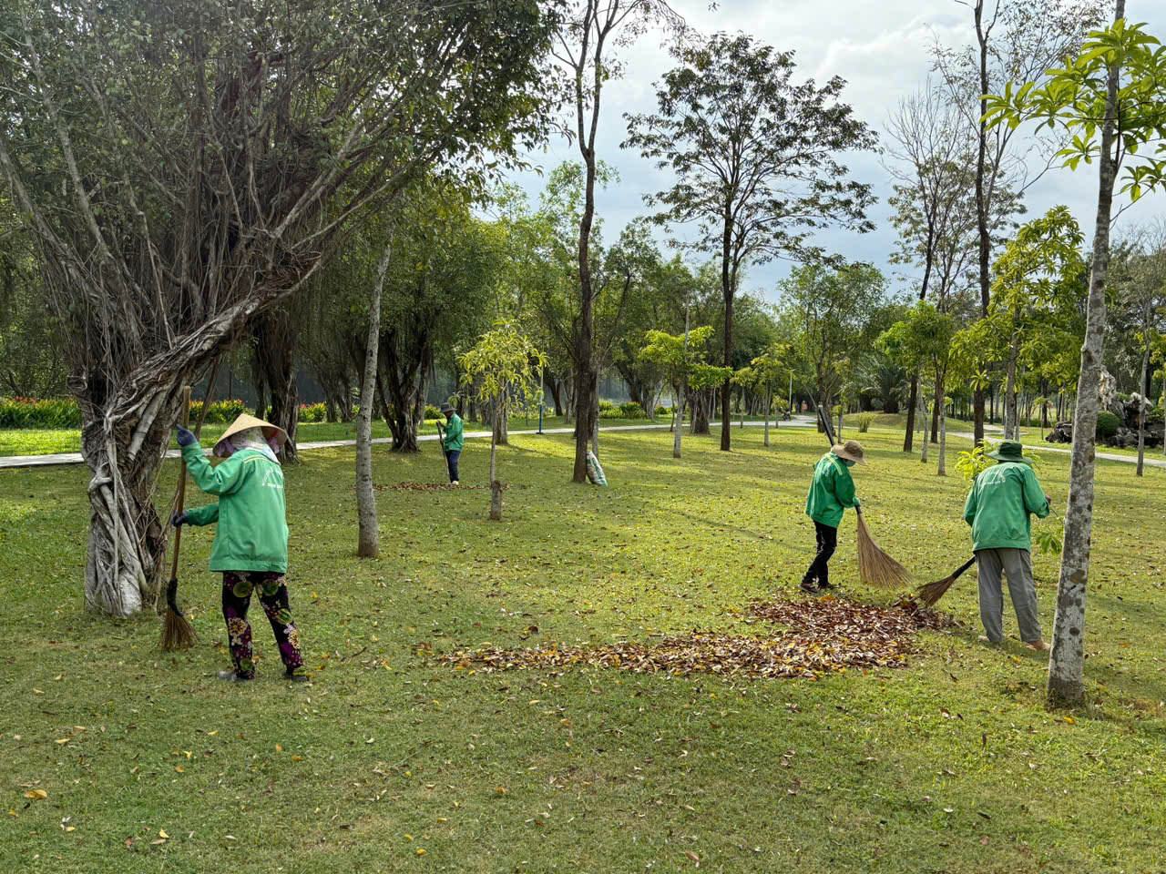 Hình ảnh đội ngũ nhân công quét lá trong công viên cho thấy quy trình làm việc đồng bộ và khoa học: