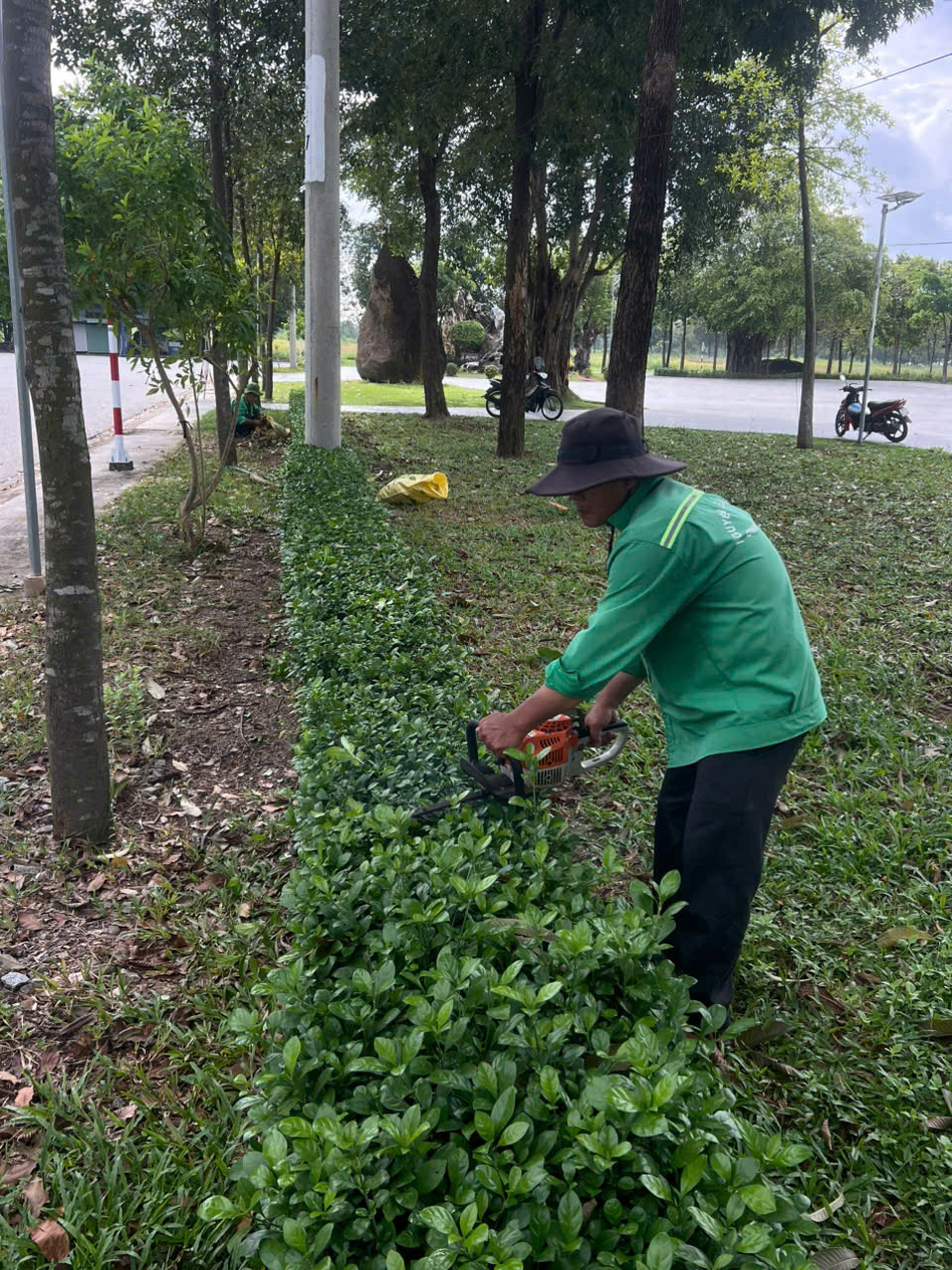 Nhân viên Nguyễn Lê Landscapes thực hiện phát cỏ bằng máy cắt chuyên dụng, sau đó gom cỏ và thu dọn gọn gàng toàn bộ diện tích.